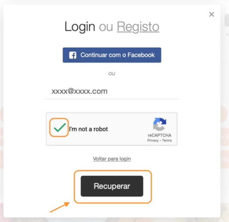 3) Escrever o seu endereço de e-mai registado na sua conta Bosque Feliz, fazer a verificação reCAPTCHA e clicar em "Recuperar"