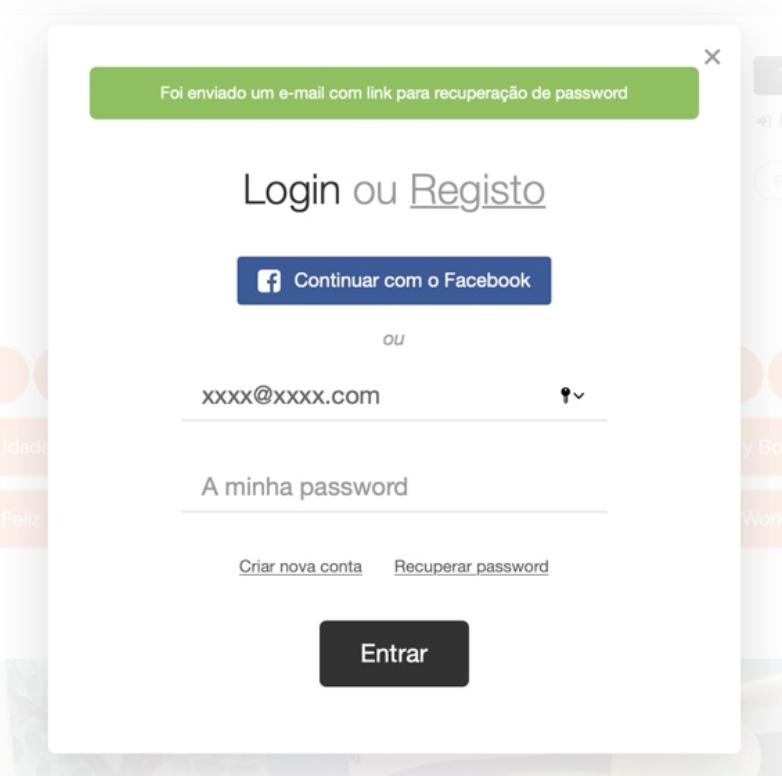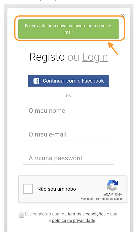4) Irá aparecer uma notificação numa janela verde que irá lhe informar que recebeu um link para recuperação de password no seu e-mail.