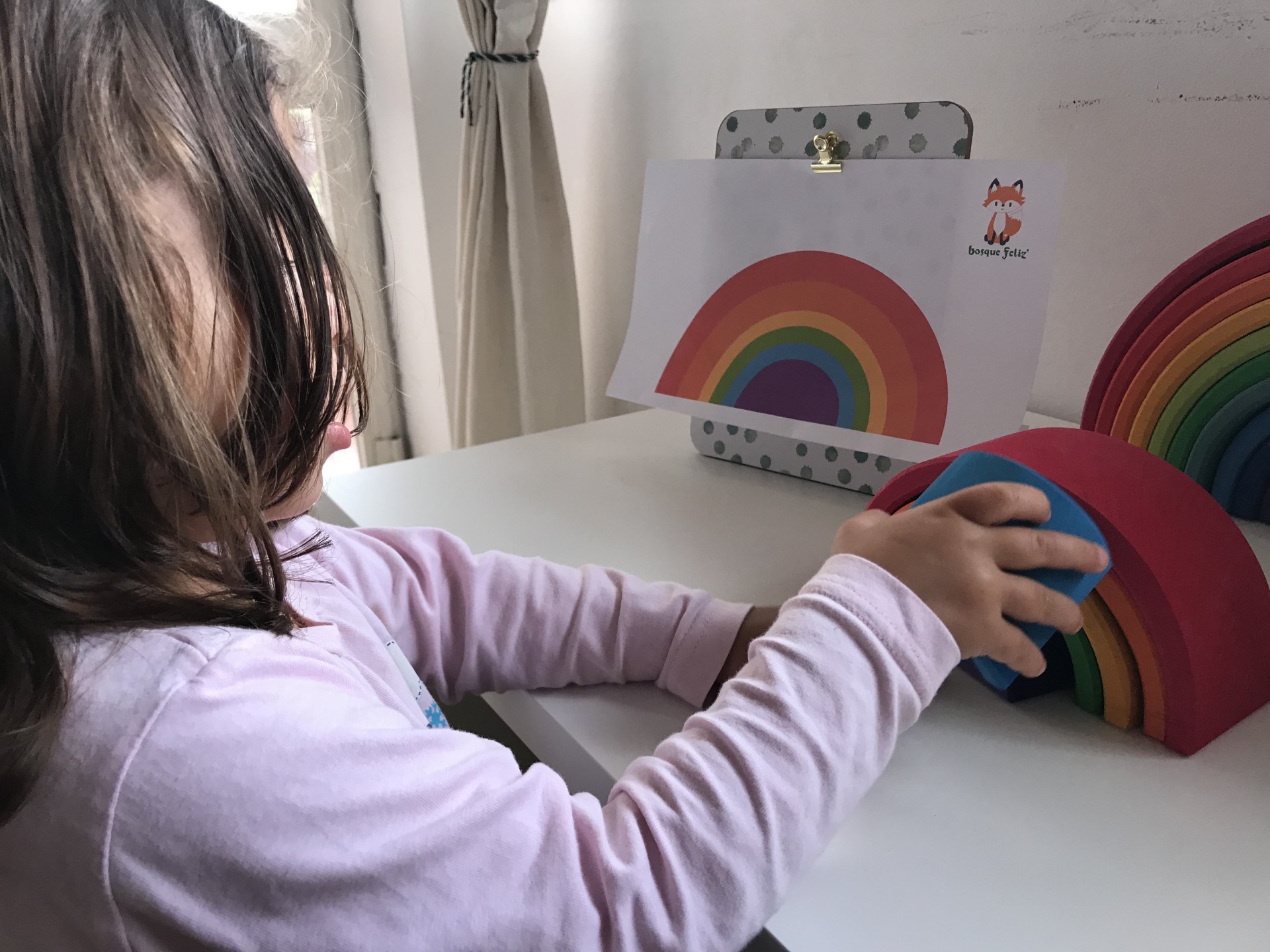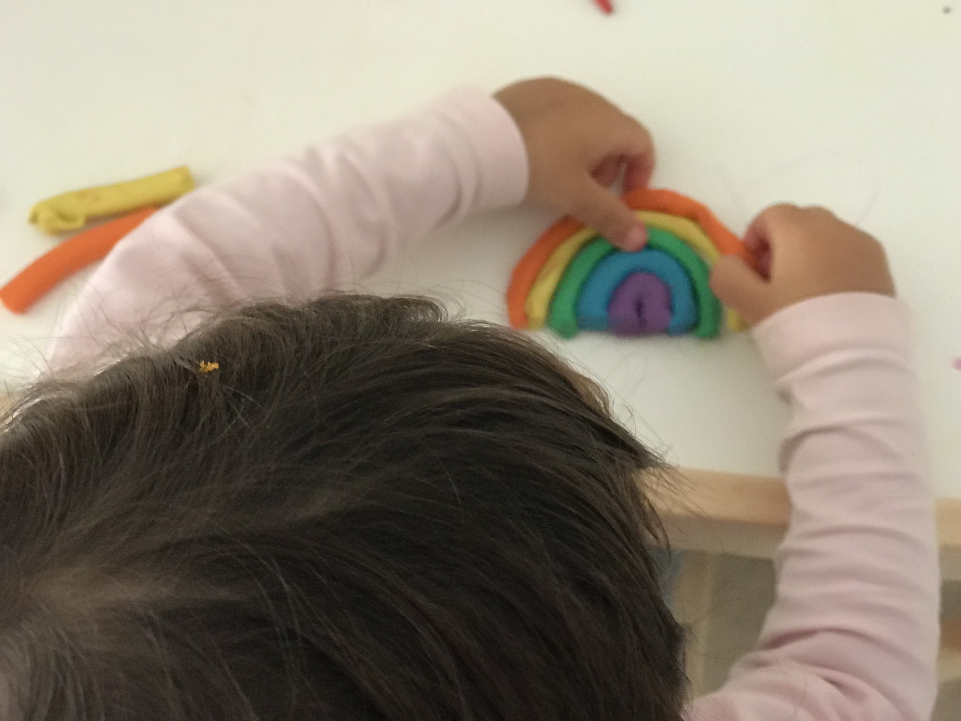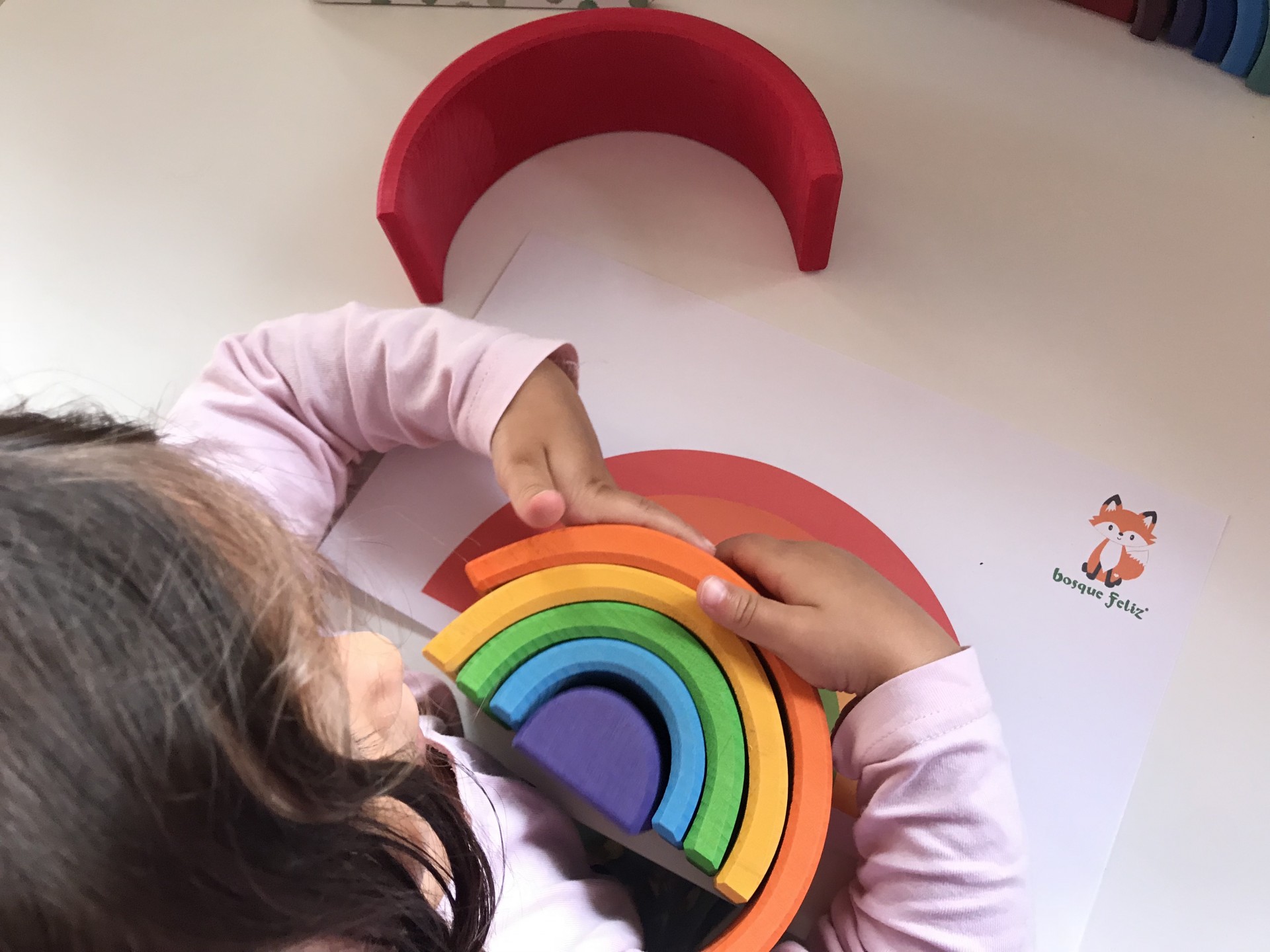 Explorou o arco-íris de 6 arcos de várias formas: encaixou, empilhou, ordenou, correspondeu os arcos com cada arco do desenho que tinha para explorar. Pode fazer download <aqui>.