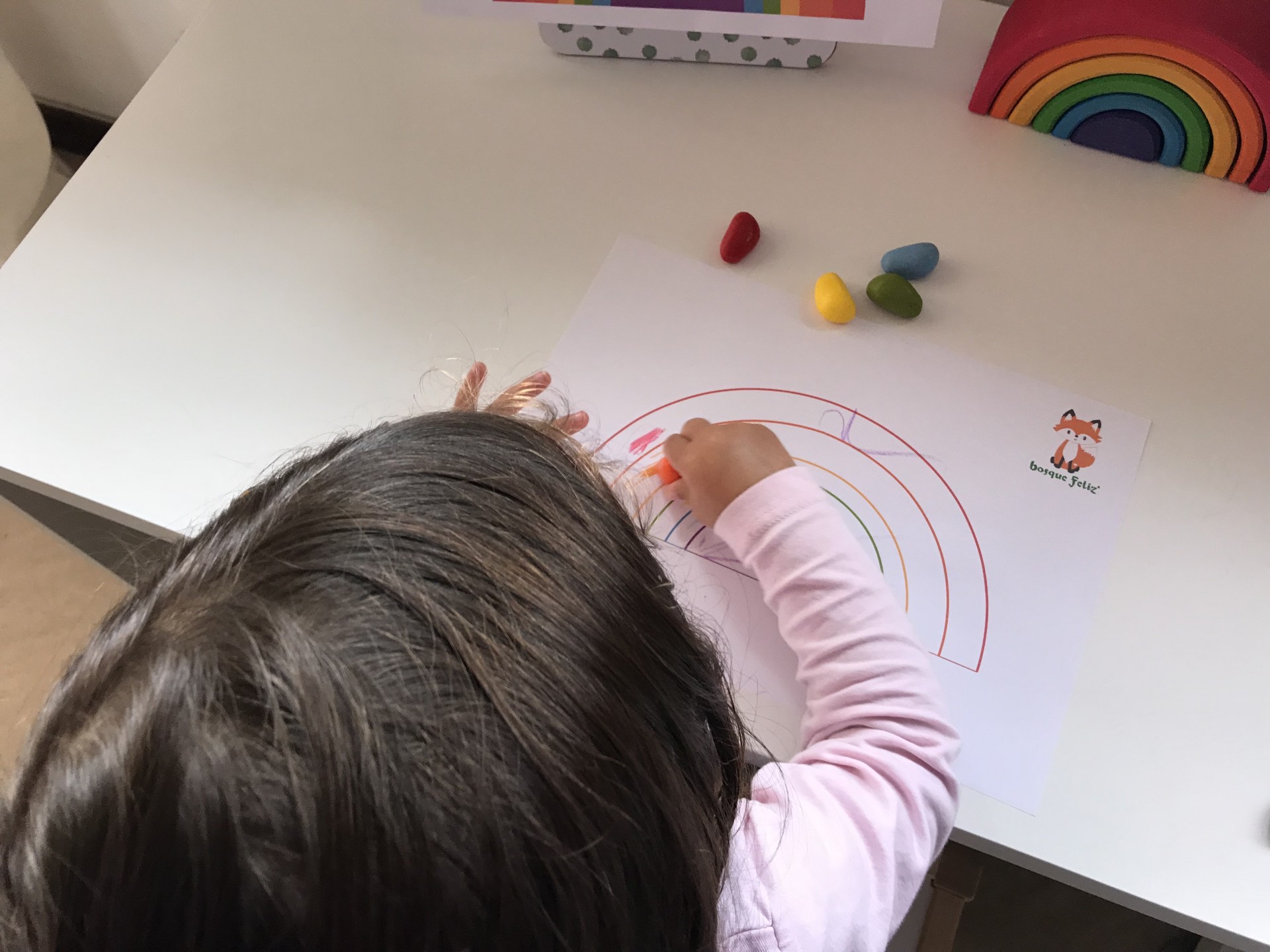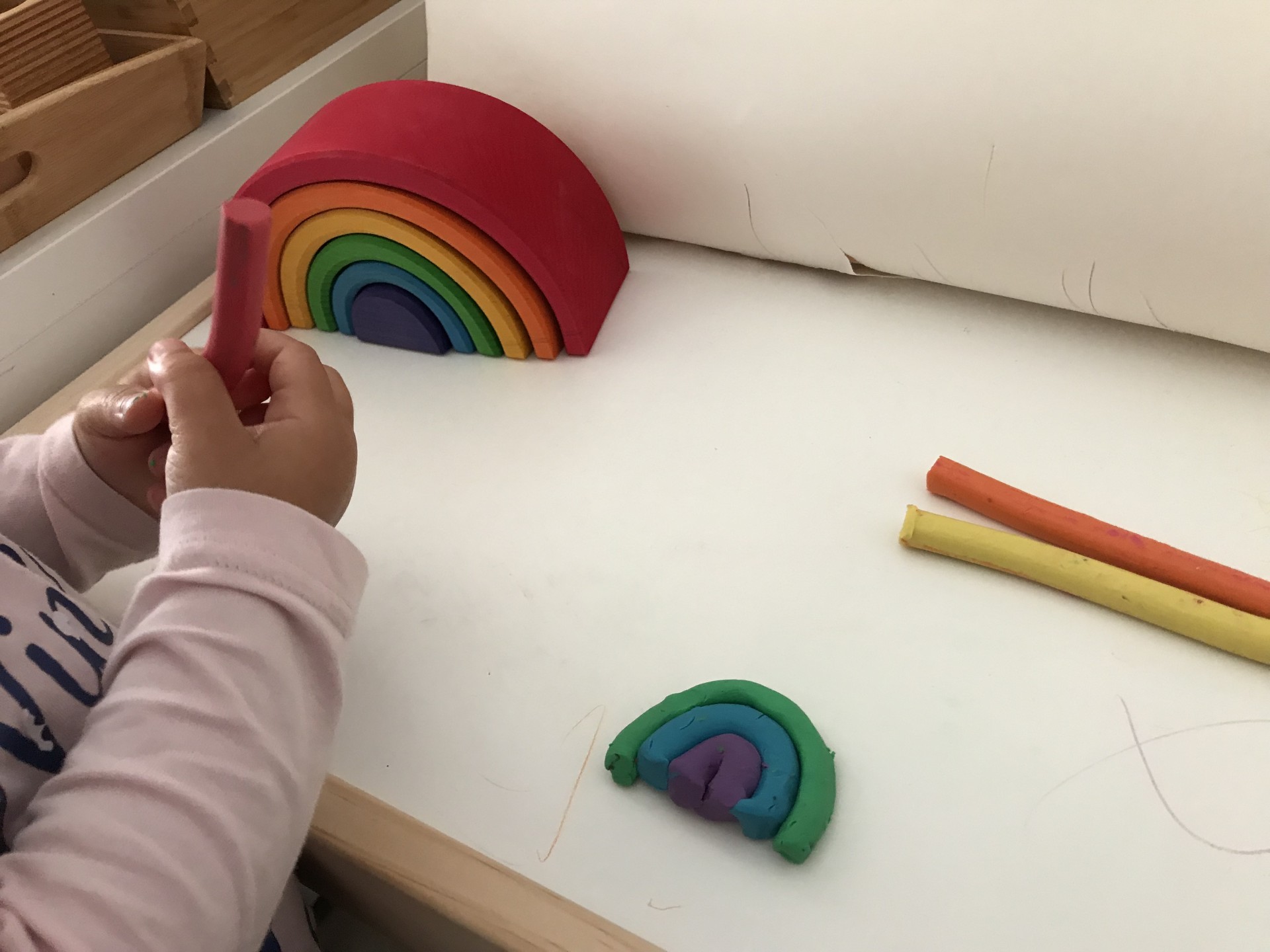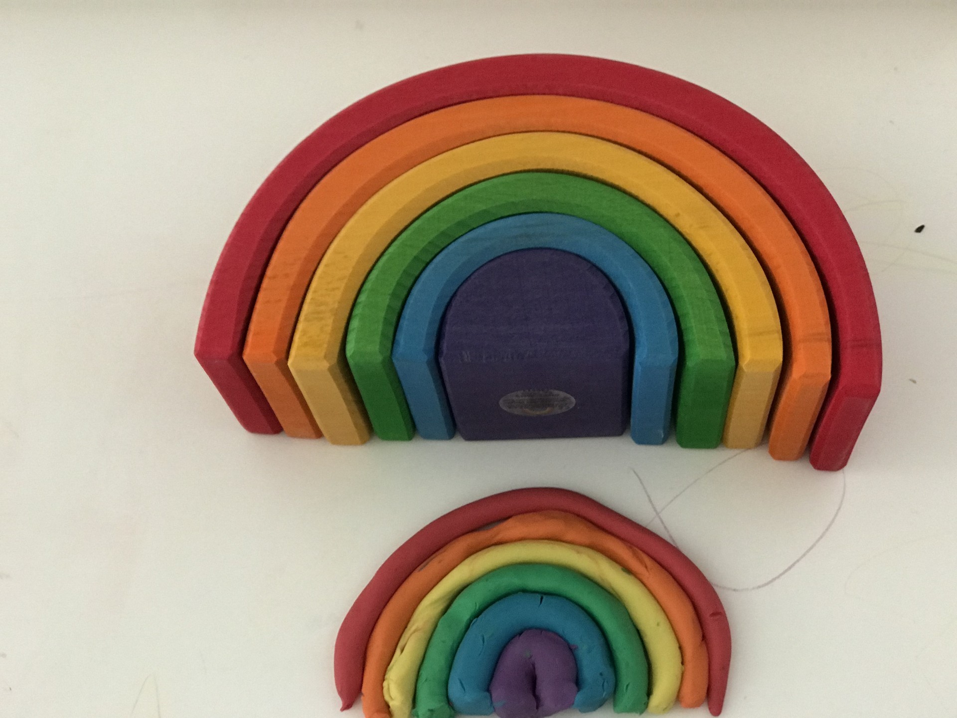 Explorou o arco-íris de 6 arcos de várias formas: encaixou, empilhou, ordenou, correspondeu os arcos com cada arco do desenho que tinha para explorar. Pode fazer download <aqui>.