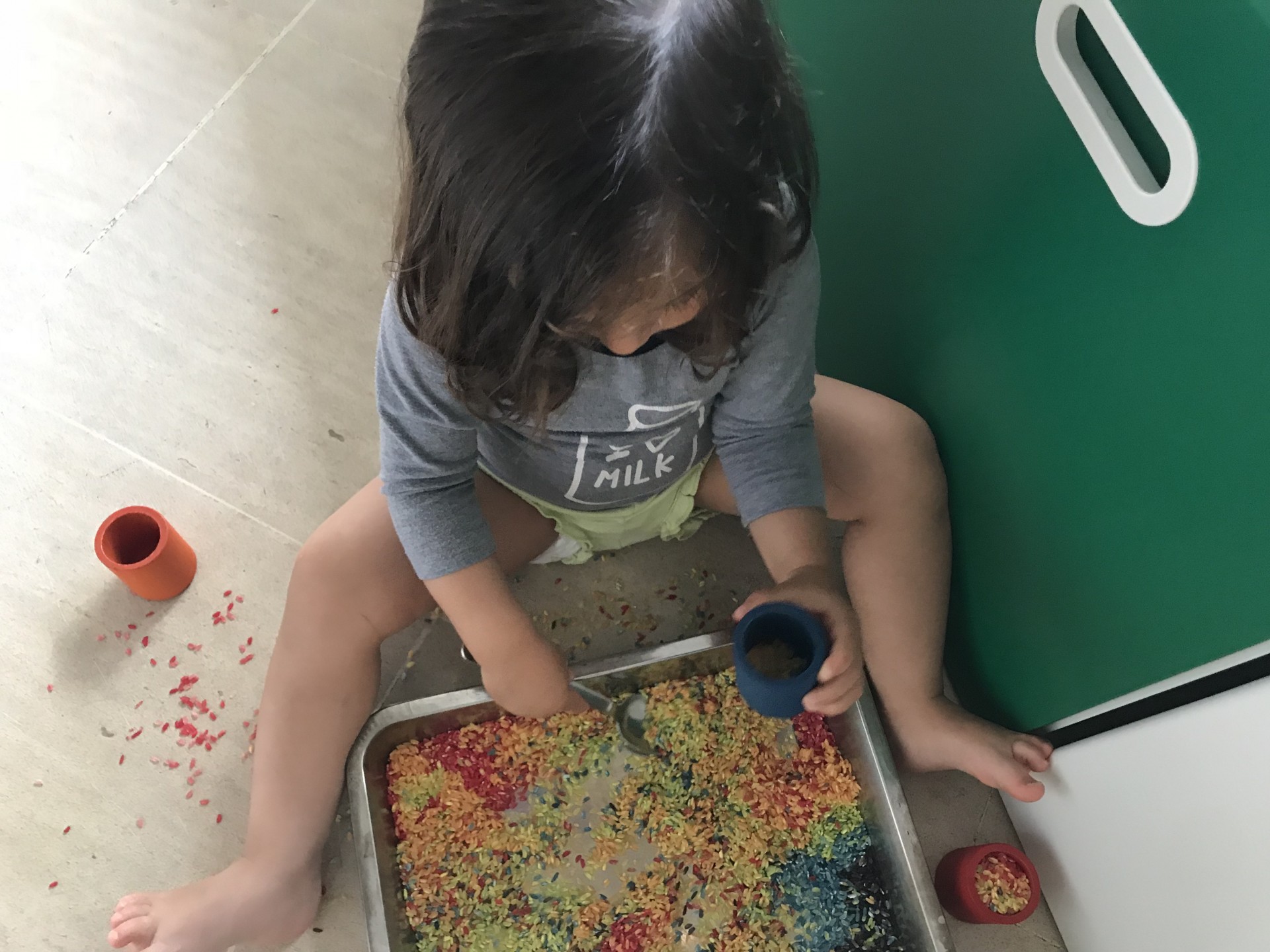 Ah, e não se preocupem, não houve desperdício nenhum. Comeu-se arroz colorido ao jantar e o que sobrou está no pote de vidro para as próximas atividades.