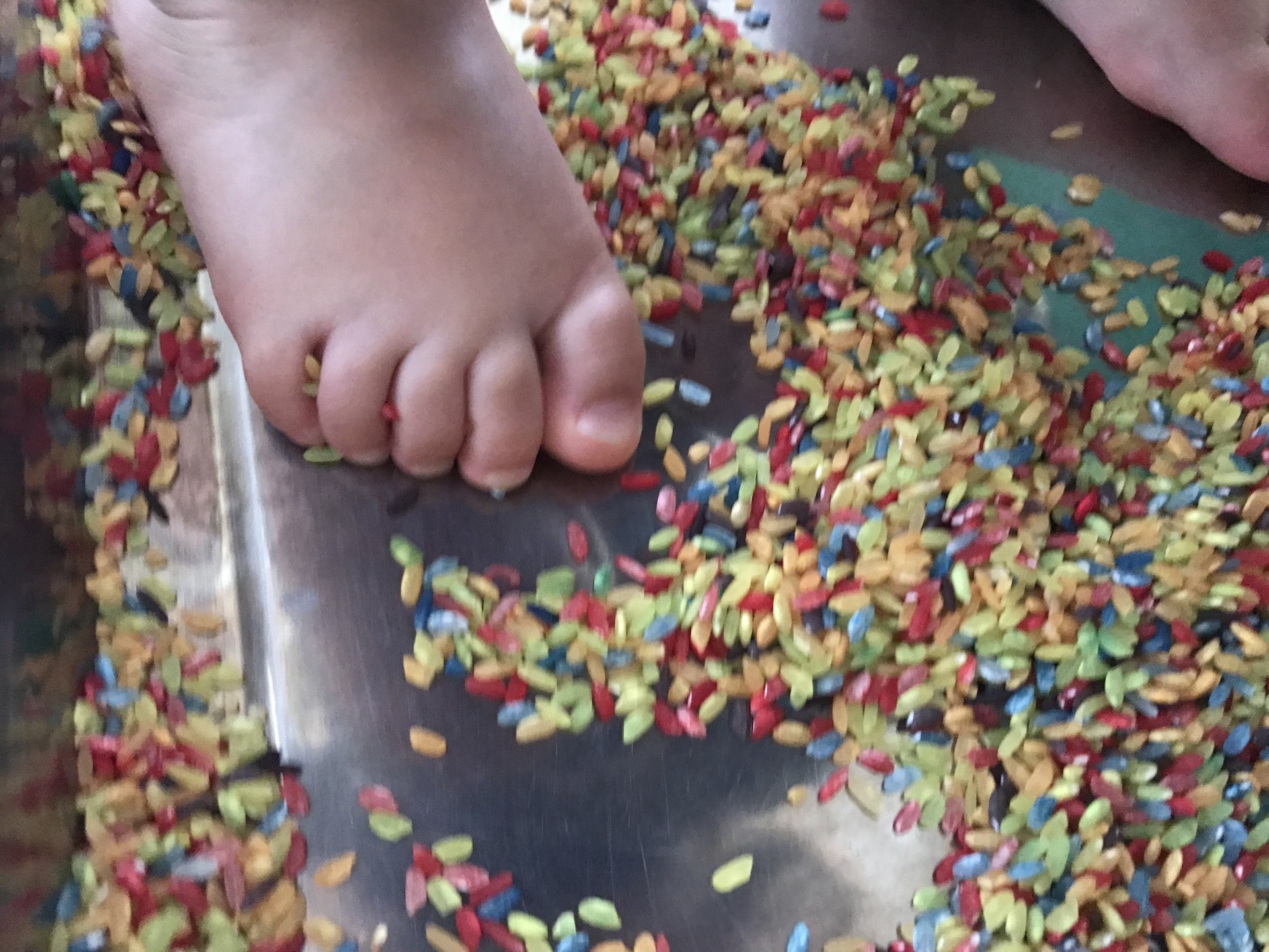 Esta brincaderia sensorial rendeu-nos, sem a parte da limpeza, umas boas 2 horas. Deixei-a totalmente livre e sempre a observar, em silêncio. Meixa nos potes da Grapat, colocou lá dentro o arroz, tapou, fez chocalho - colocava pouco arroz, depis muito e divertia-se a vê-lo cair - pisou, comeu arroz cru, espalhou... foi uma diversão só.