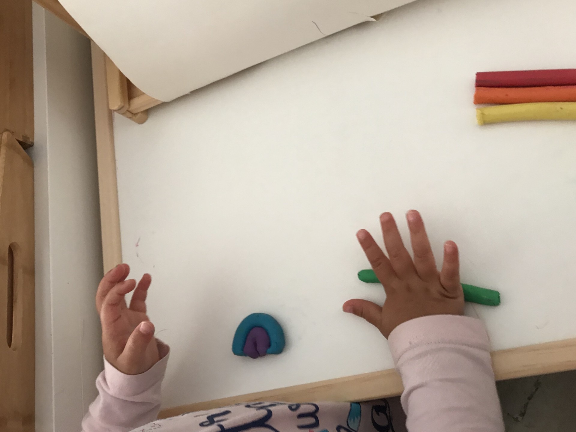 Depois foi a vez de plasticina natural (usamos esta) a proporcionar momentos sensoriais e motores maravilhosos... Depois disso ainda fez bolinhas de cada cor, bolinhas grandes e pequenas, com direito a cantria enquanto divertia-se a aprender.