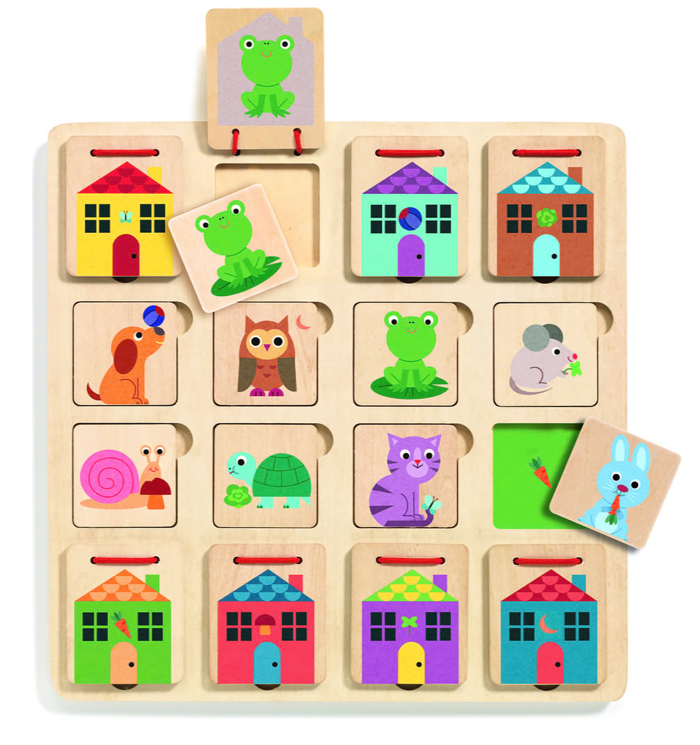 Este divertido puzzle de madeira é um jogo super animado para os pequeninos: Quem mora onde? Quem come o quê? Levanta as abas para brincar de esconde-esconde com os animais e descobre quem come o quê.