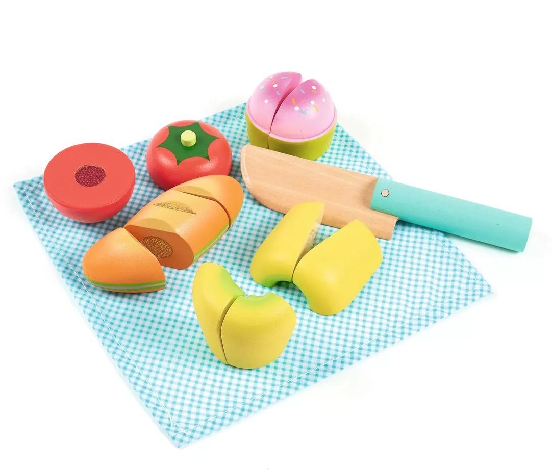 Conteúdo: 13 peças: 1 toalha de mesa de tecido, 2 pedaços de tomate, 2 pedaços de bolo, 3 pedaços de pão, 4 pedaços de maçã e 1 faca (de madeira).