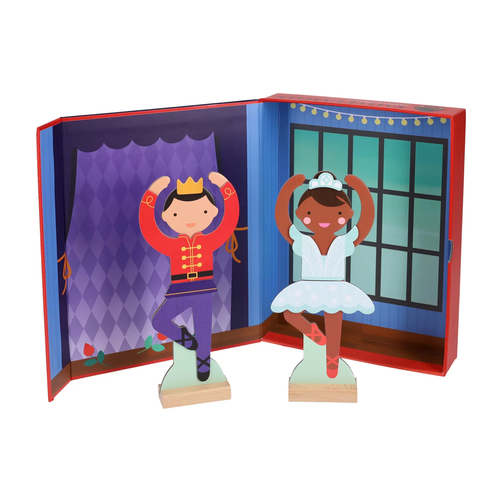 Com 30 peças magnéticas, você pode criar mais de 100 combinações de figurinos e, depois de escolher a melhor roupa, coloque as bailarinas em frente ao cenário teatral para que o espetáculo comece!
