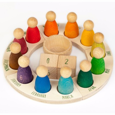 Contém: 12 Nins com cores de acordo com os meses e estações do ano na pedagogia Waldorf, 1 Pote, 2 Cubos numéricos, 4 secções com os meses do ano que formam o Arco do Calendário.