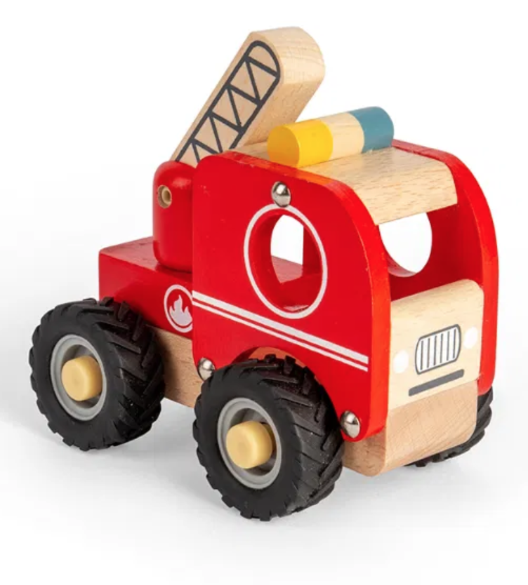 Crie brincadeiras imaginativas com este brinquedo camião de bombeiro em madeira dimensionado para mãos pequenas, auxiliando no desenvolvimento motor fino e nas habilidades de agarrar e soltar objetos das crianças.