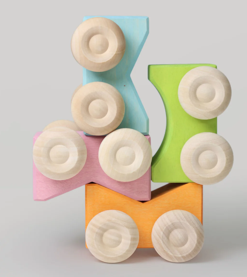 Os carrinhos empilháveis combinam dois temas populares nas brincadeiras infantis: podem ser empilhados e podem rolar.