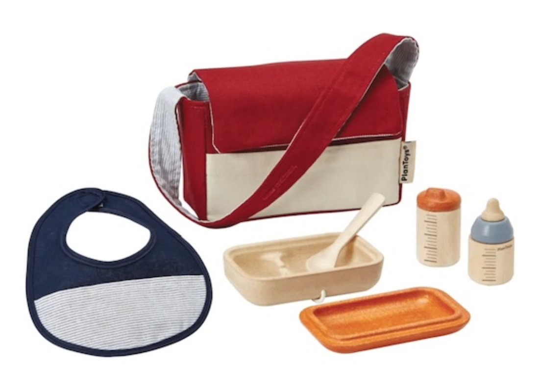 Este conjunto de alimentação de boneca vem com uma bolsa, que pode ser pendurada num carrinho, um recipiente para guardar alimentos, colher, babete, garrafa de água e biberão. Este conjunto ajuda as crianças a desenvolver um senso de amor e carinho através da dramatização de papéis.