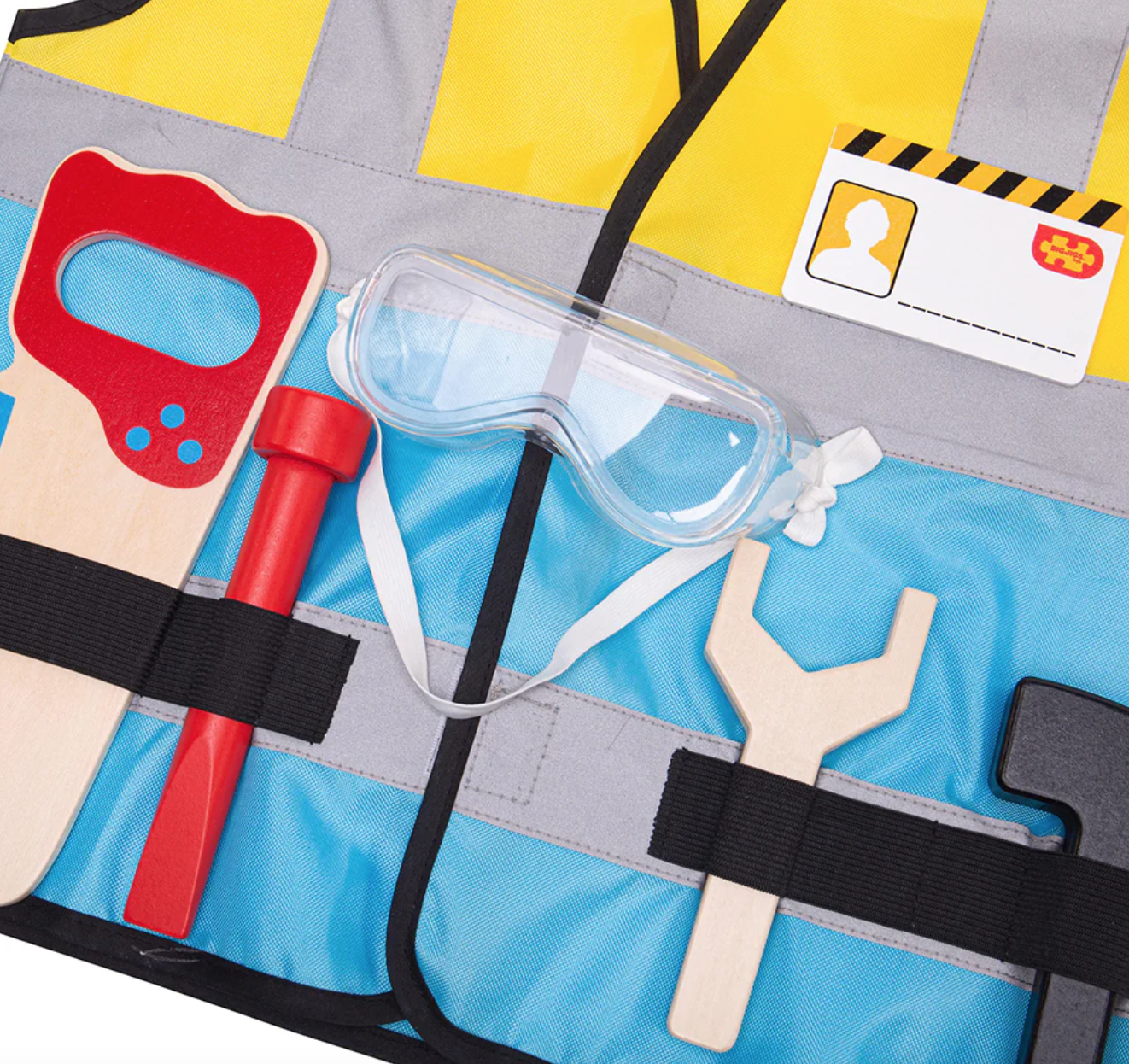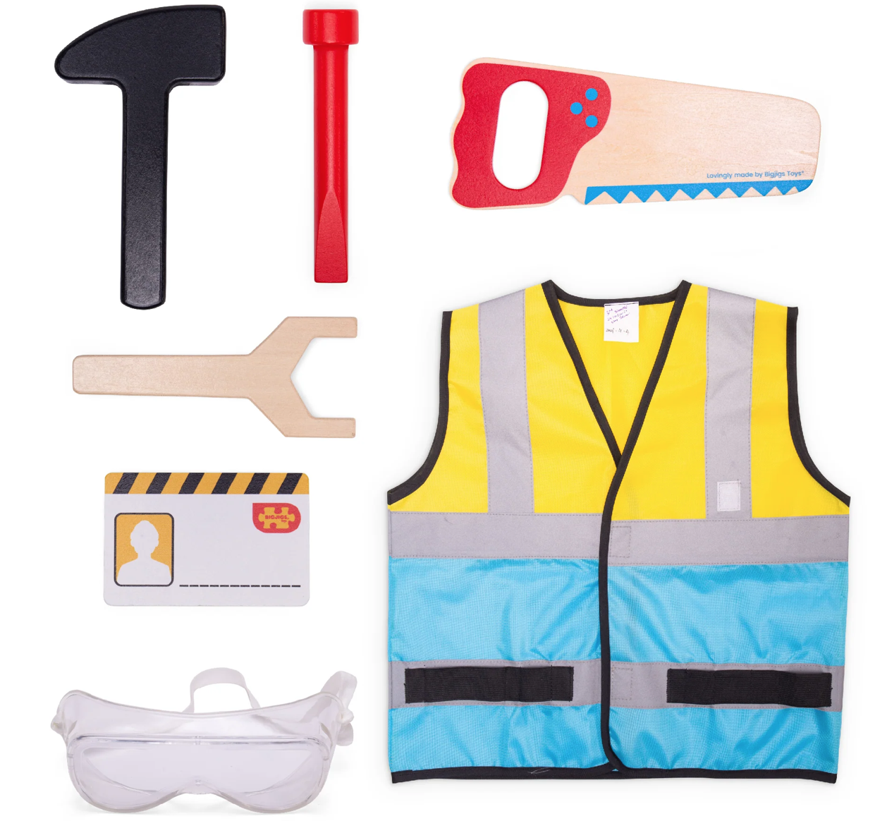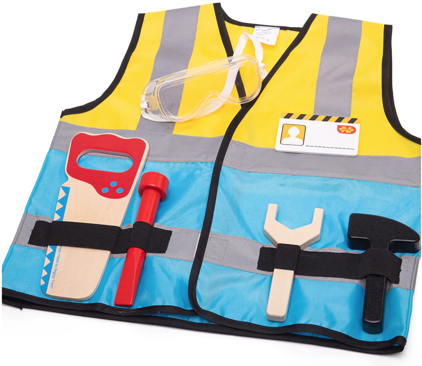 Contém: colete amarelo e azul fluorescente, serra de madeira, chave de fendas, chave inglesa, martelo, óculos de segurança e crachá de identificação