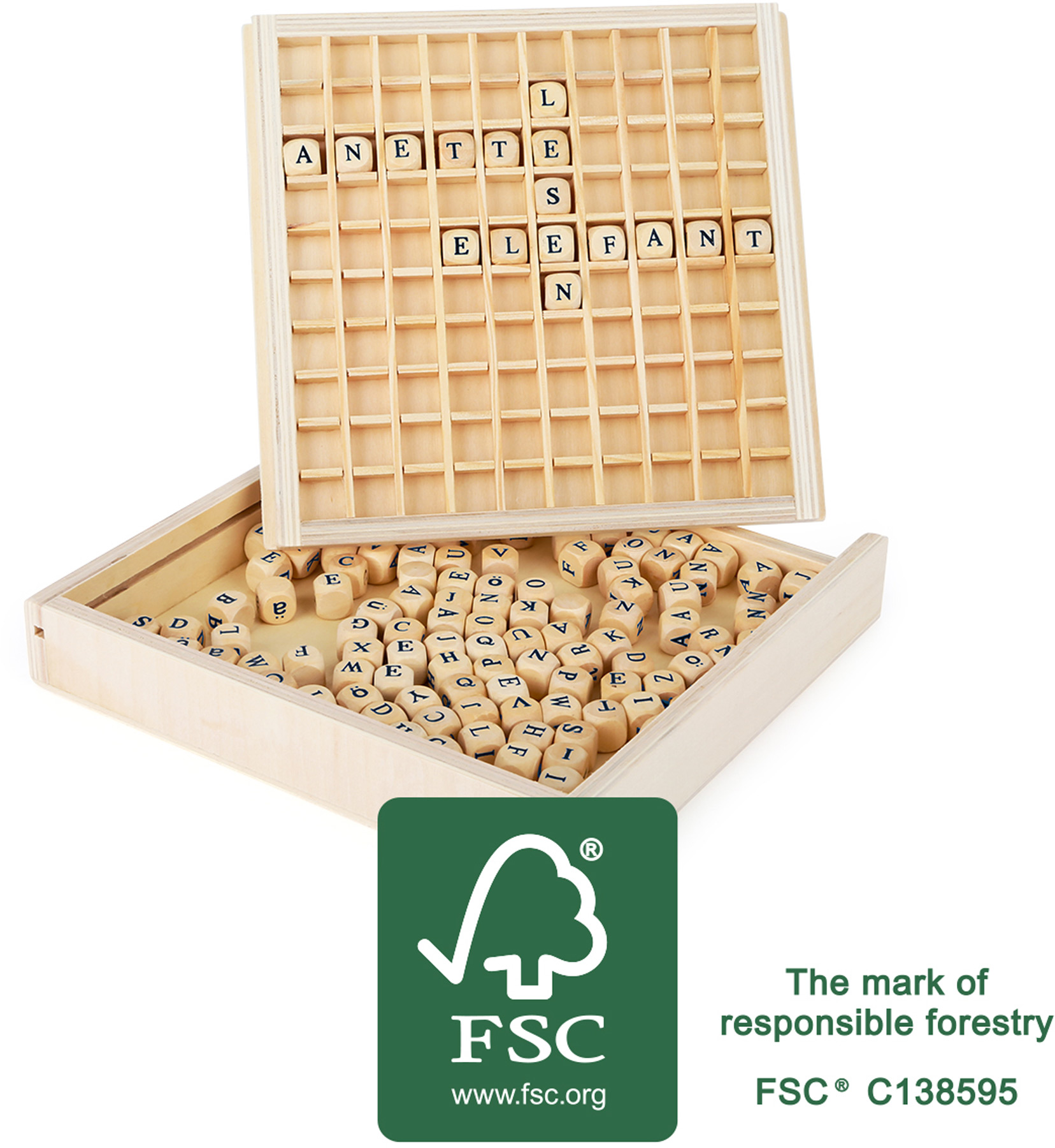 With these letter-dice made of FSC® 100%-certified wood, children can create their first words.