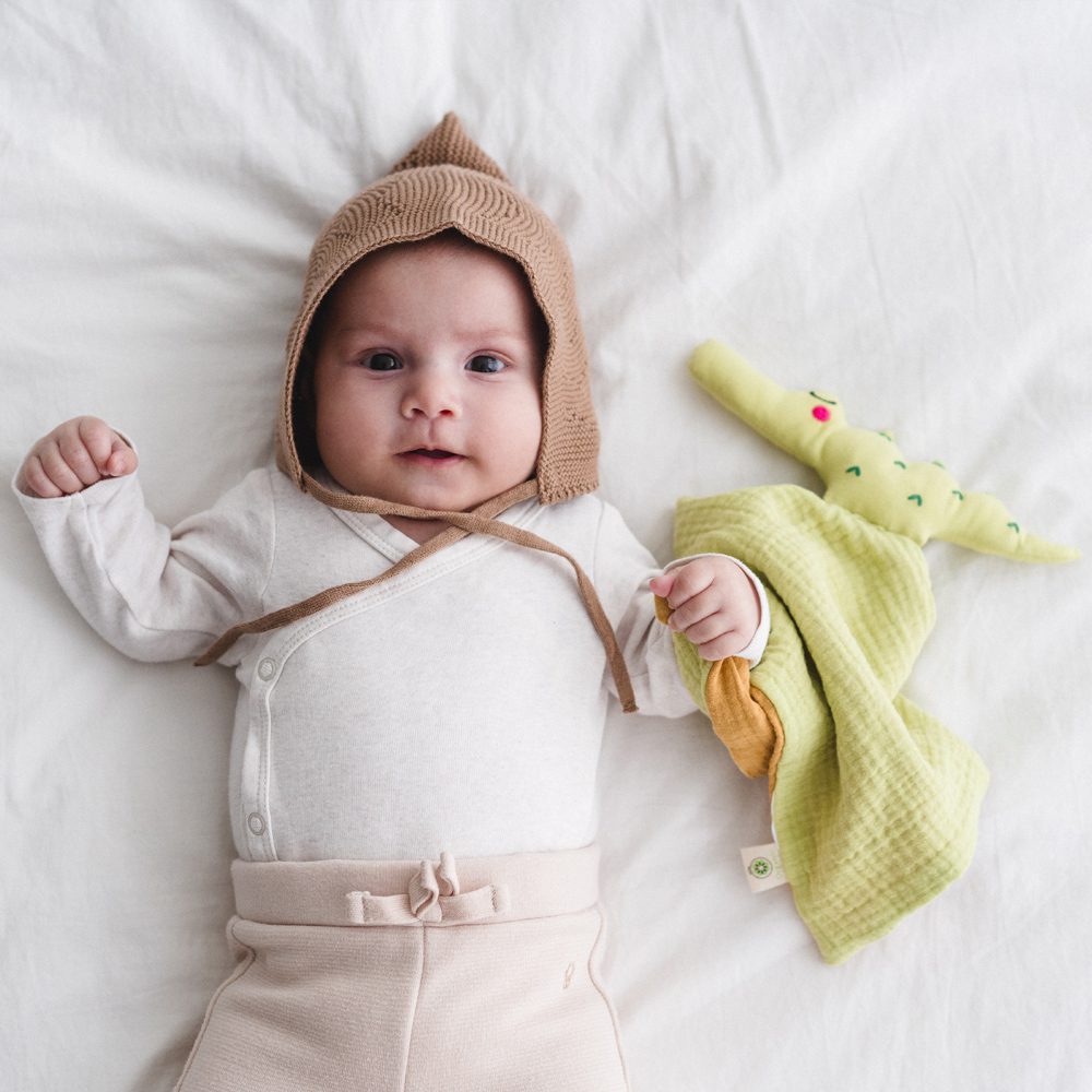 Podem ser lavados na máquina a uma temperatura máxima de 40 graus, sem centrifugação, feitos de 100% algodão orgânico e enchimento de fibra de milho.