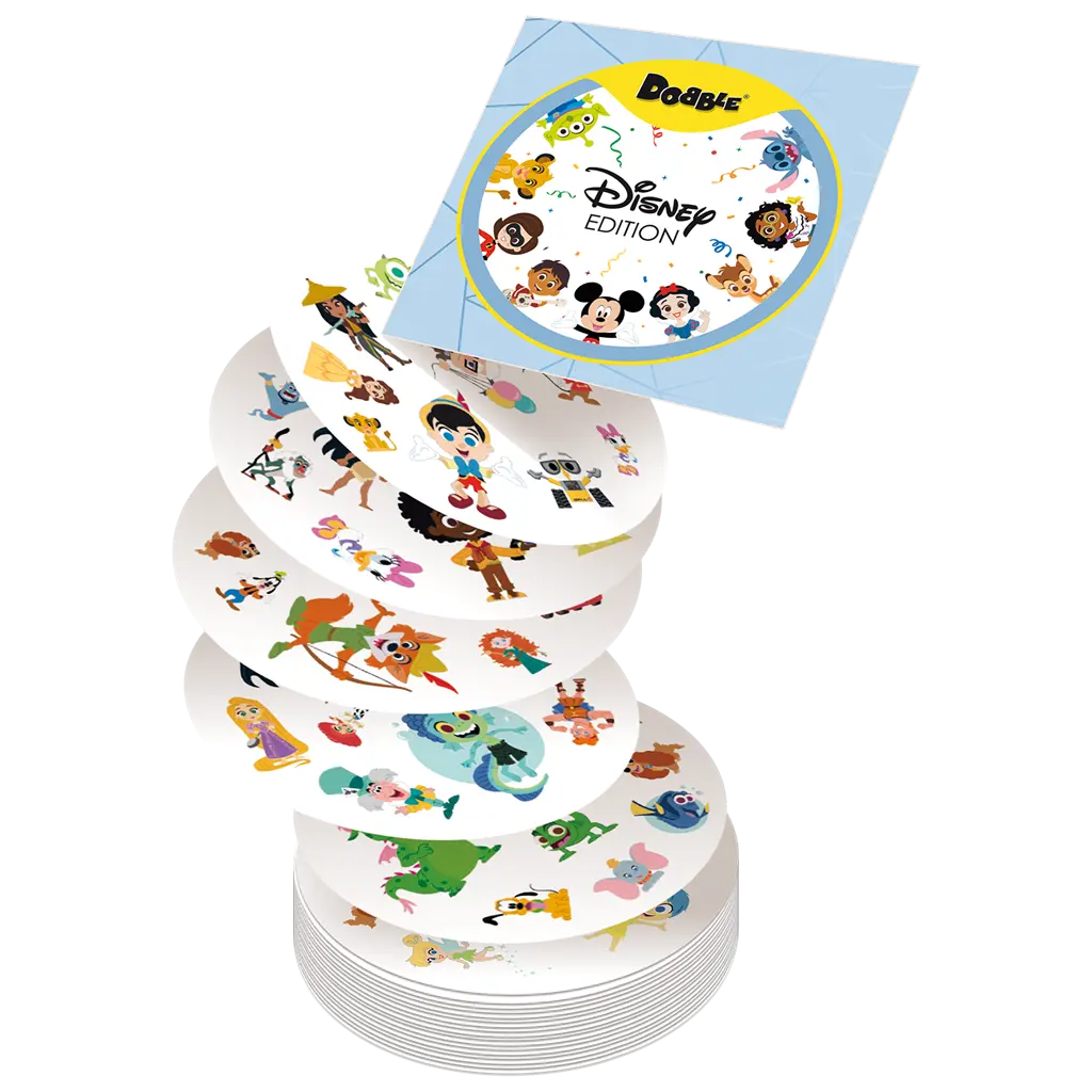 O Dobble Disney é uma edição limitada comemorativa! Como é fácil de adivinhar, os jogadores terão a difícil missão de identificar qual é o símbolo igual entre duas cartas. Não é uma tarefa simples porque os símbolos têm tamanhos diferentes e esse pequeno pormenor baralha mesmo o cérebro de todos. Este é um desafio de rapidez, observação e reflexos que já venceu vários prémios internacionais. Dobble Disney pode ser jogado em 5 variantes diferentes o que o torna numa fonte quase inesgotável de diversão. Este jogos tem mais cartas e ainda maiores! Existem 90 cartas com 10 símbolos com 91 personagens diferentes dos teus filmes favoritos.