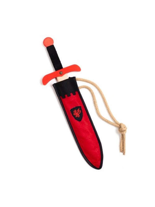 Material: Espada de madeira de faia muito resistente, Cabo forrado com couro, Capa de feltro com corda para amarrar na cintura. Escudo com leão bordado.