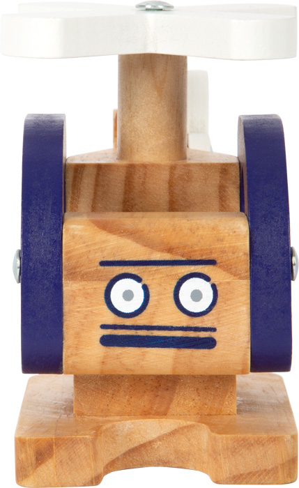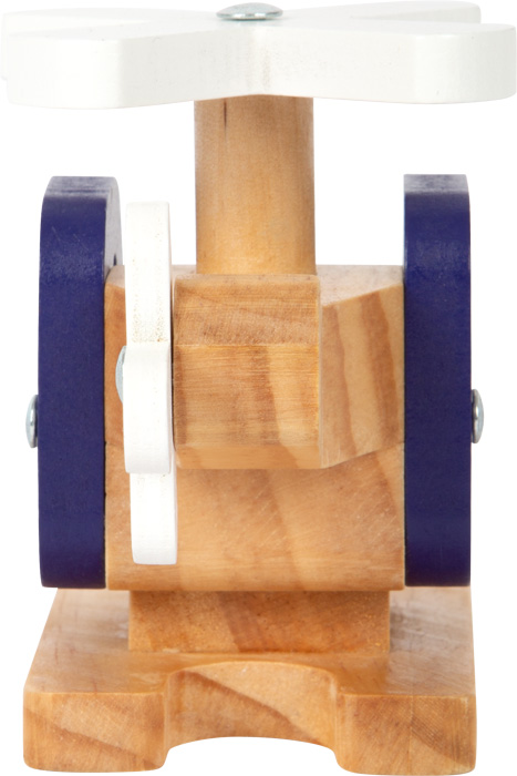 Helicóptero de madeira com pás rotativas, pode ser agarrado facilmente por mãos pequenas graças às aberturas das janelas, fabricado em madeira 100% certificada FSC®