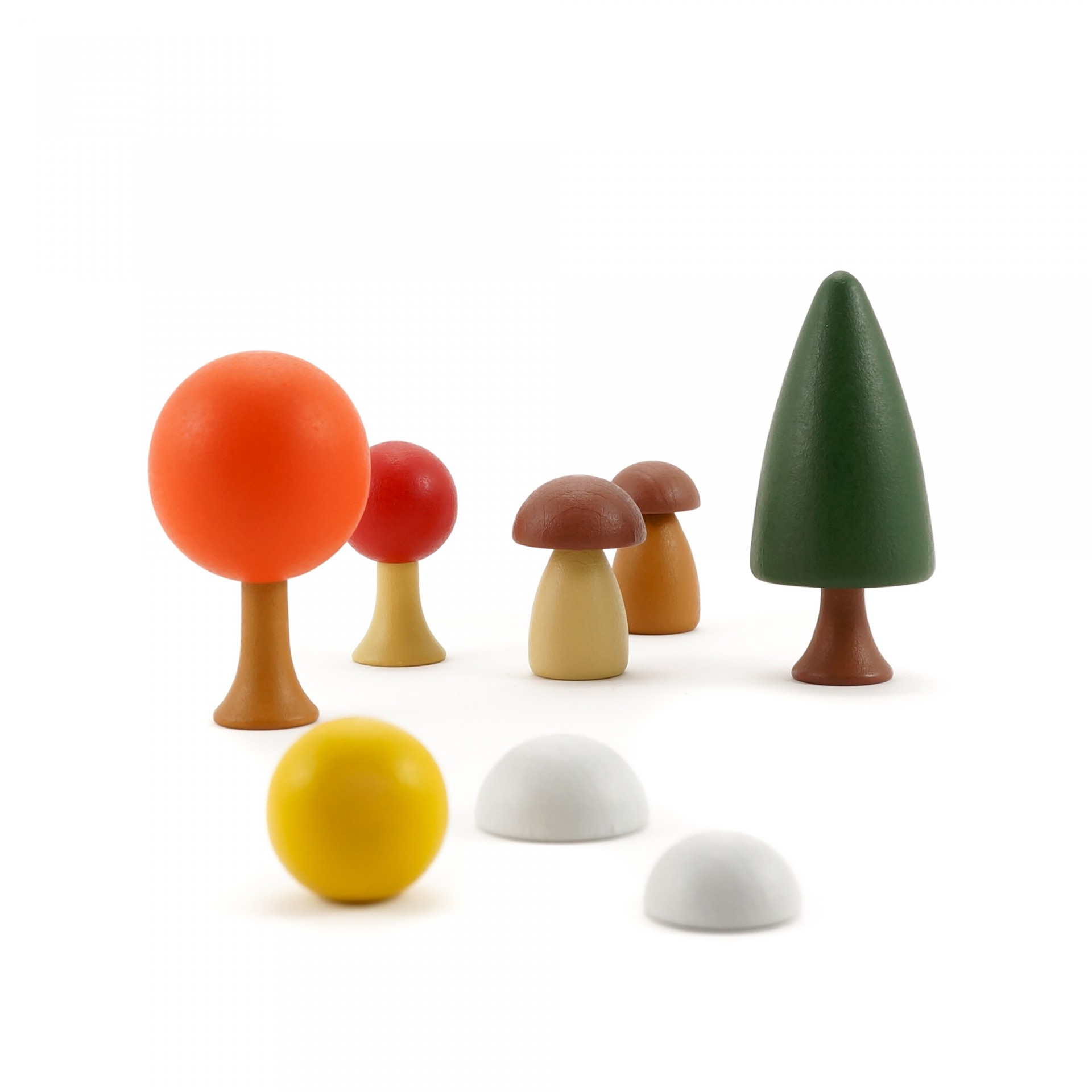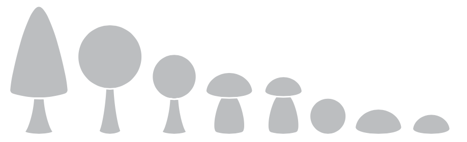 Quantidade: 8 unidades (2 árvores grandes, 1 árvore pequena, 1 arbusto, 2 cogumelos e 2 pedras)