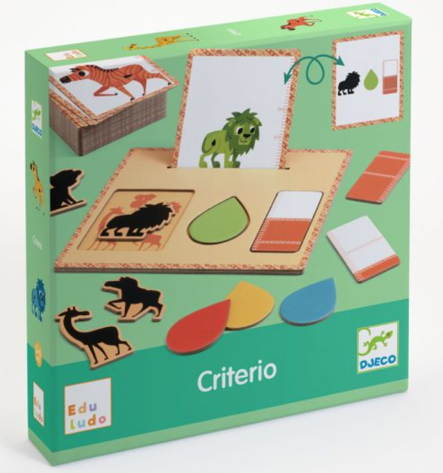 Um jogo de correspondência de critérios. Escolhe um animal e encontra os 3 critérios correspondentes (forma, cor e tamanho).
