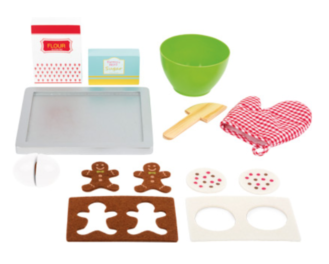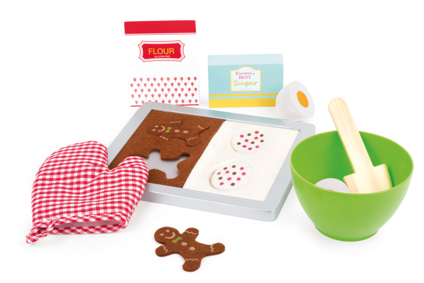 Biscoitos e bonecos de gengibre feitos de feltro podem ser feitos com este lindo conjunto de confeitaria de madeira.