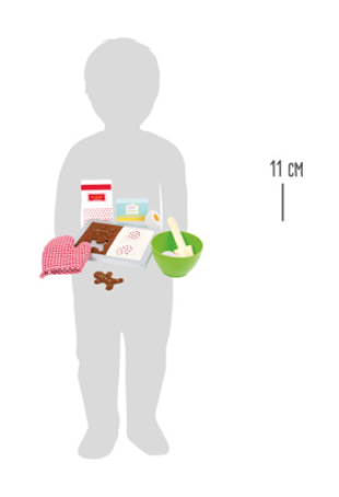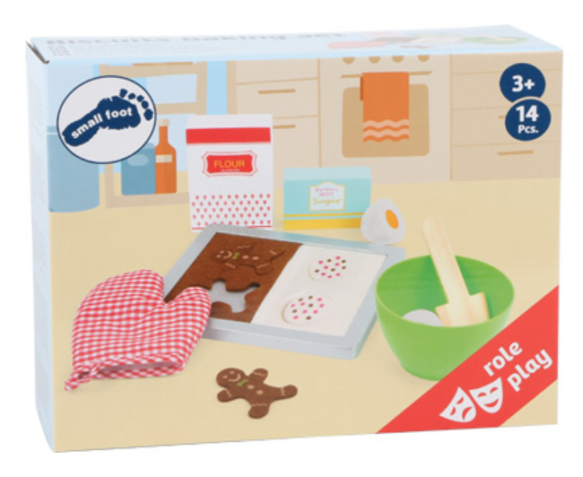 Contém: 1 tigela, 1 raspador, 2 ovos, 1 farinha, 1 açúcar, 1 luva, 1 assadeira, 2 massas, 4 biscoitos.