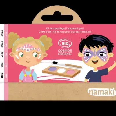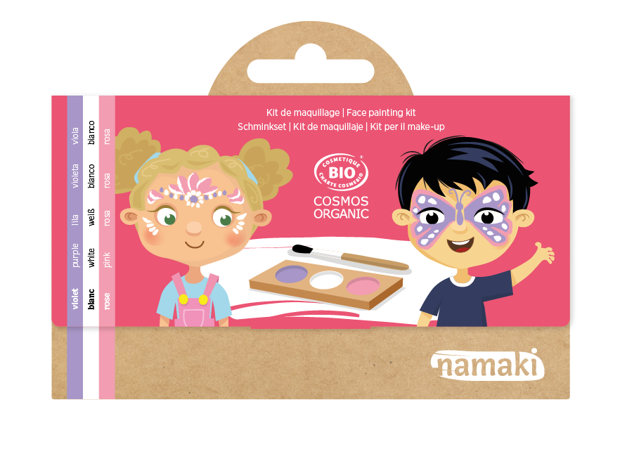 Este kit de pintura facial hipoalergênico orgânico certificado à base de água, tem tudo o que precisa para se divertir: uma paleta com 3 cores (roxo, branco e rosa), 1 pincel cosmético