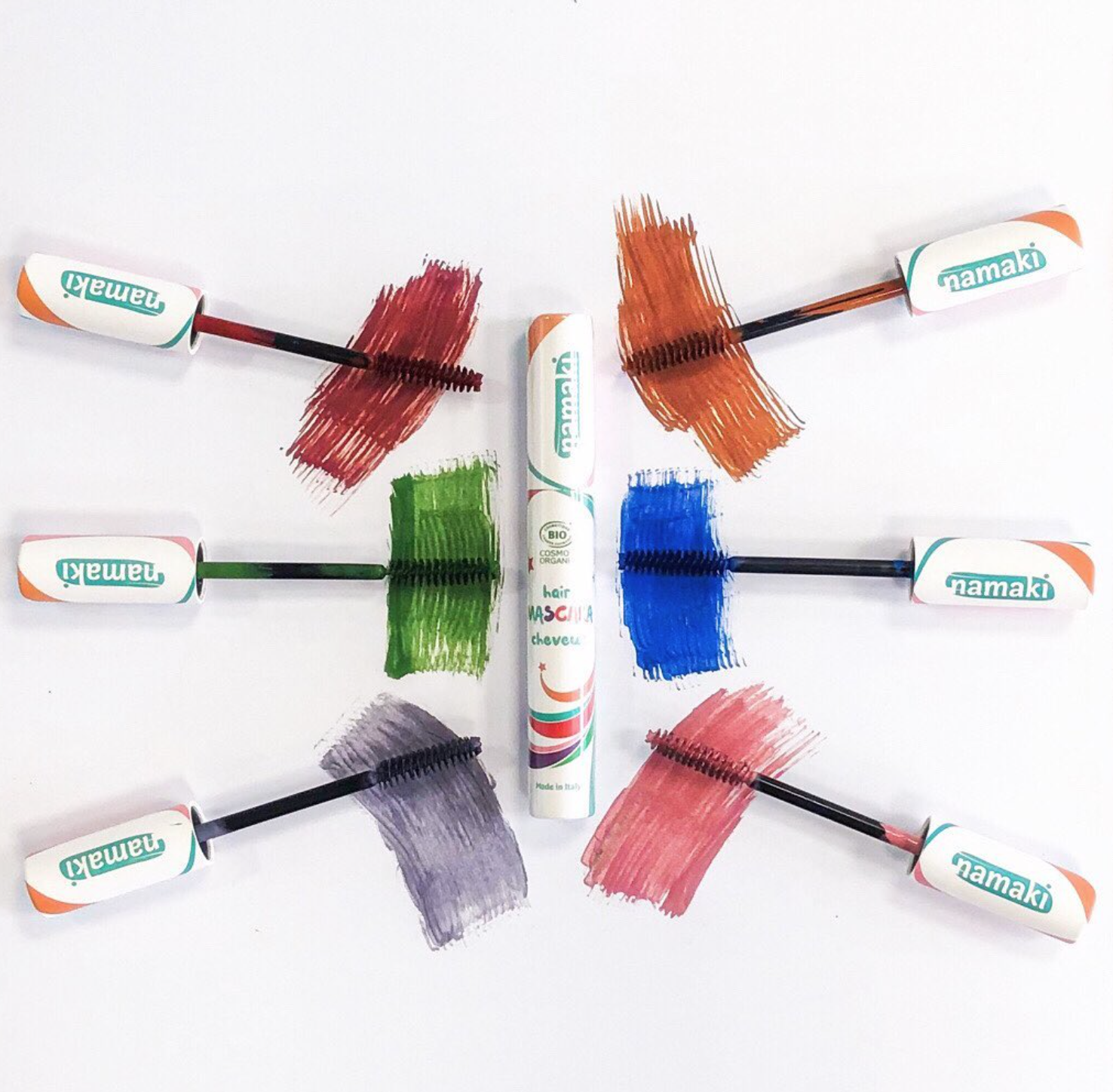 Este rímel de cabelo não tóxico para crianças, disponivel em 6 cores, é fácil de aplicar e lava-se facilmente com shampoo.
