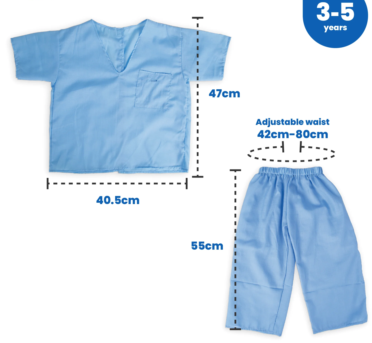 Calças: ajustáveis medem 42 cm-80 cm (16"-30") de cintura; comprimento da perna - 55 cm