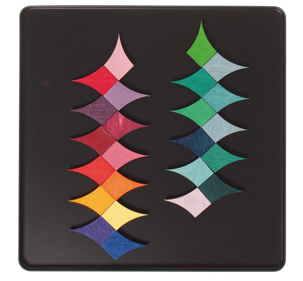Todos os jogos magnéticos da Grimm's vêm em uma caixa de lata preta, que pode ser usada imediatamente para brincar.
