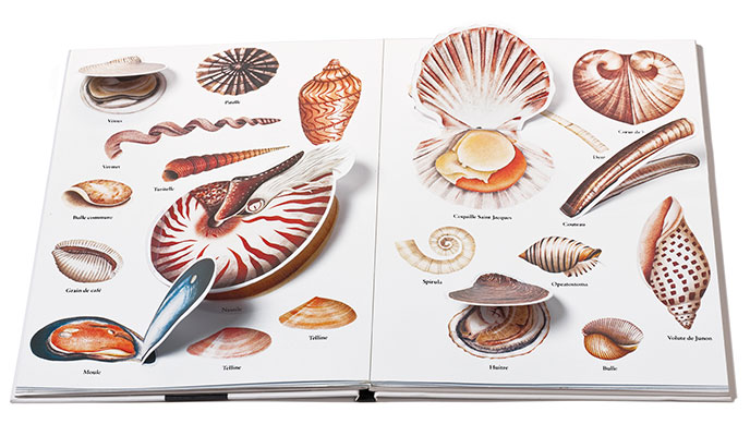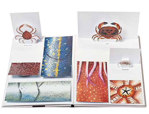 Nacéo, paru en 2012, fait partie d’une série de quatre ouvrages documentaires – Axinamu, Oxiseau, Nacéo etDinorauses – qui s’est imposé par son approche ludique, l’originalité de sa conception et la beauté de ses illustrations réalisées au pochoir. Cette série a connu un grand succès et a été traduite dans de nombreuses langues. Nacéo, c’est partir à la découverte des créatures marines. On plonge dans le livre, et on nage au milieu des poissons, des crustacés et des coquillages… À qui appartiennent ces écailles ? Qu’y a-t-il à l’intérieur de ce coquillage ? Et cette ombre, est-ce celle d’une baleine ? Mais à qui sont ces pinces ? Et pour finir, un méli-mélo de poissons à reconstituer…