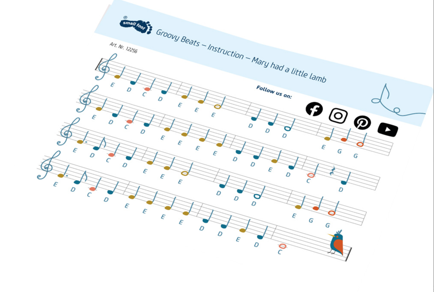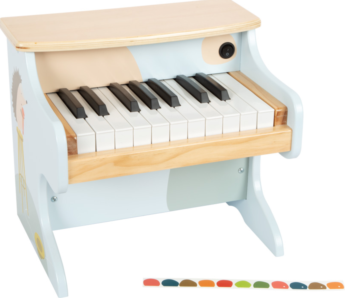Ele vem com adesivos que podem ser colados nas teclas, ajudam os pequenos músicos com suas primeiras músicas.