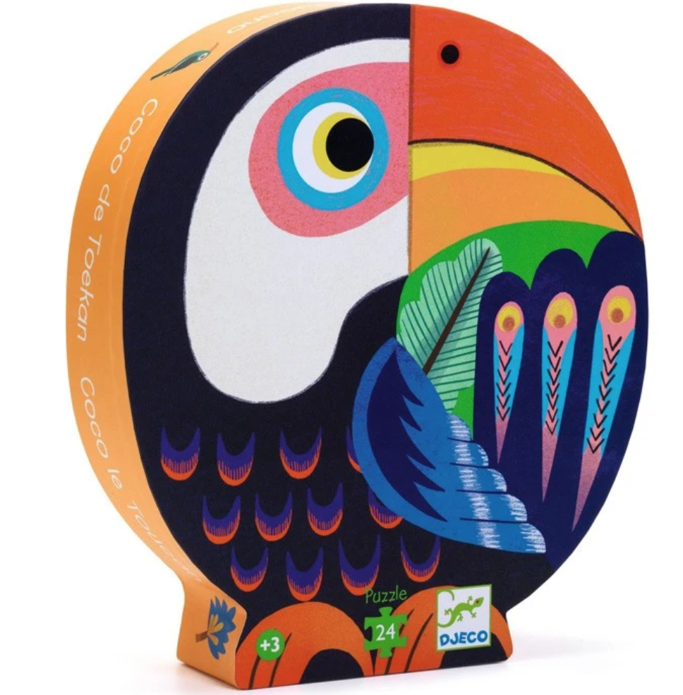 Coco, o tucano, voa para a selva para encontrar os seus amigos coloridos. Um magnífico puzzle de 24 peças numa elegante caixa em forma de tucano.