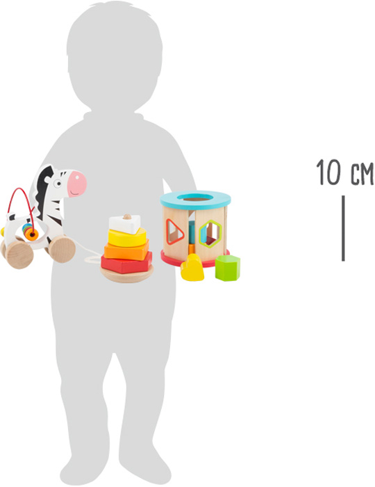 Treina as habilidades motoras das crianças e a compreensão de cores, formas e comparação de tamanhos.