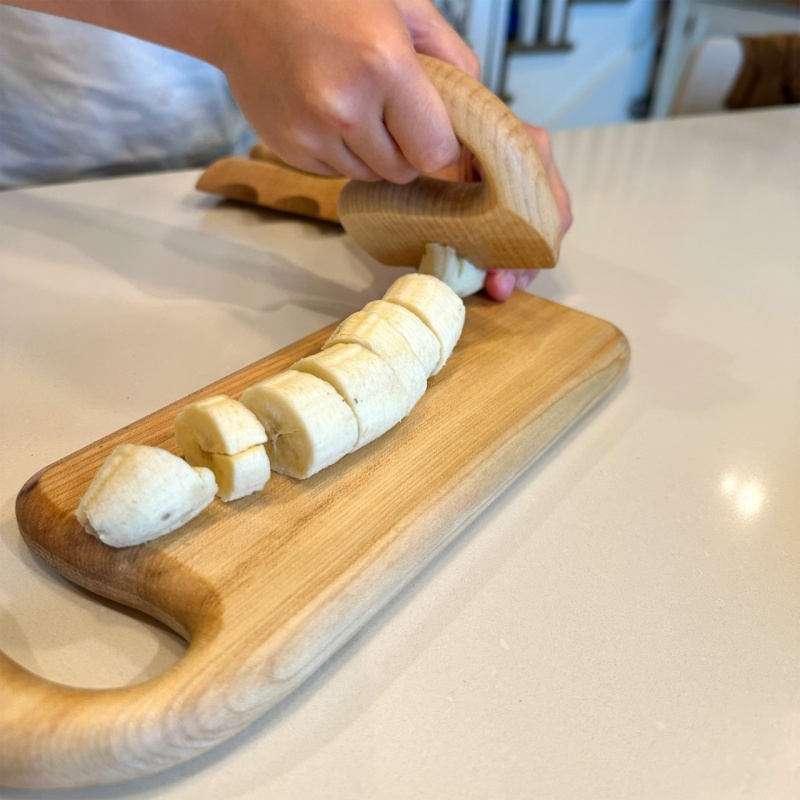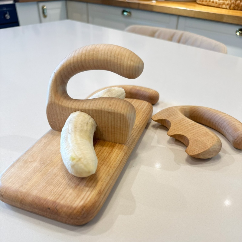 - Em madeira, com ponta mais fina para incentivar o corte, irá cortar as frutas e legumes, mas nunca os dedos.