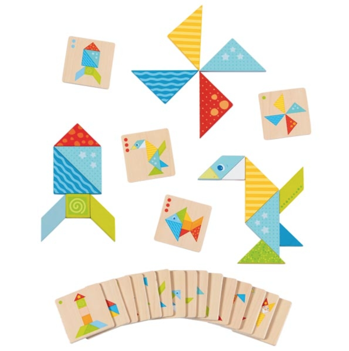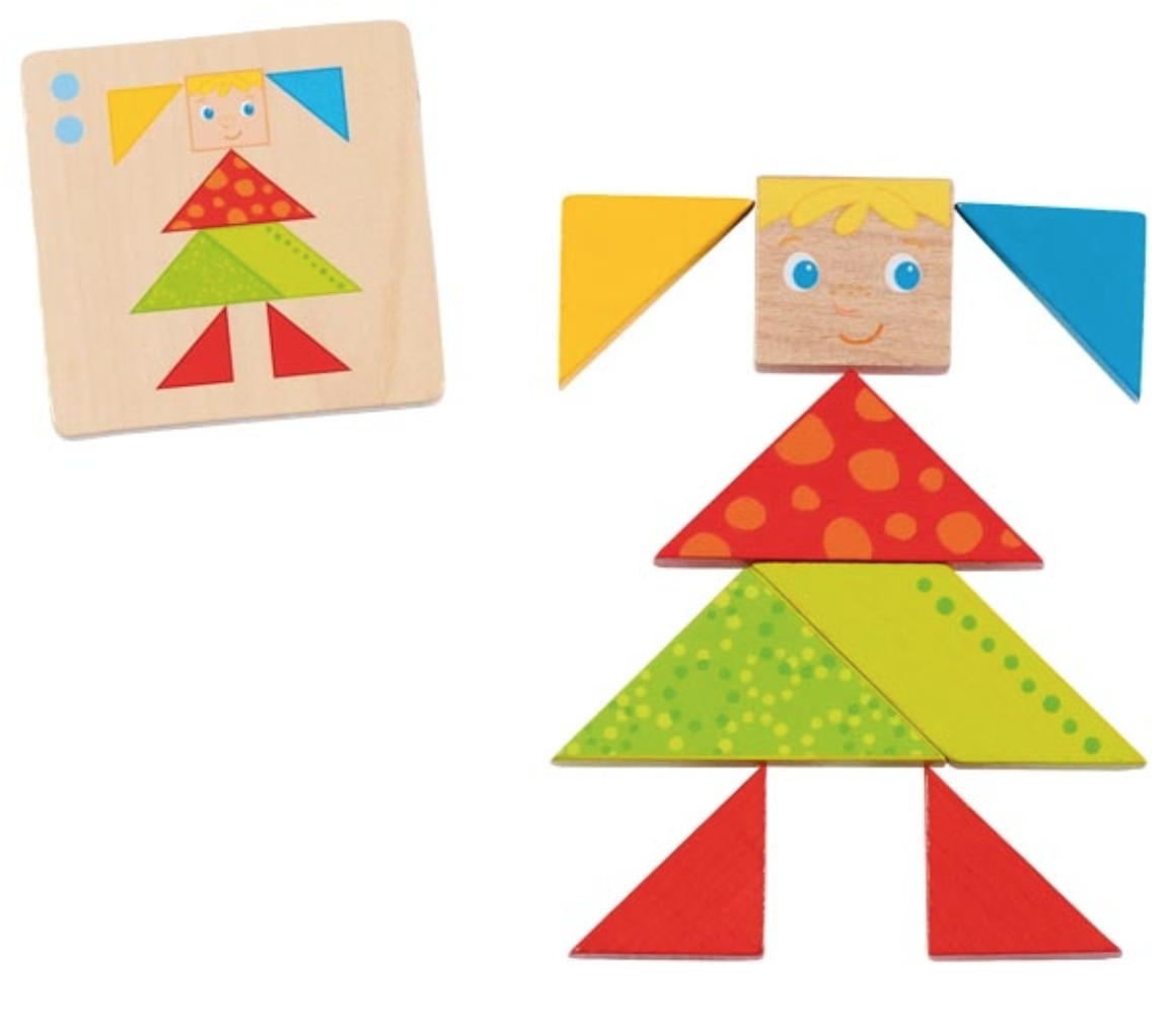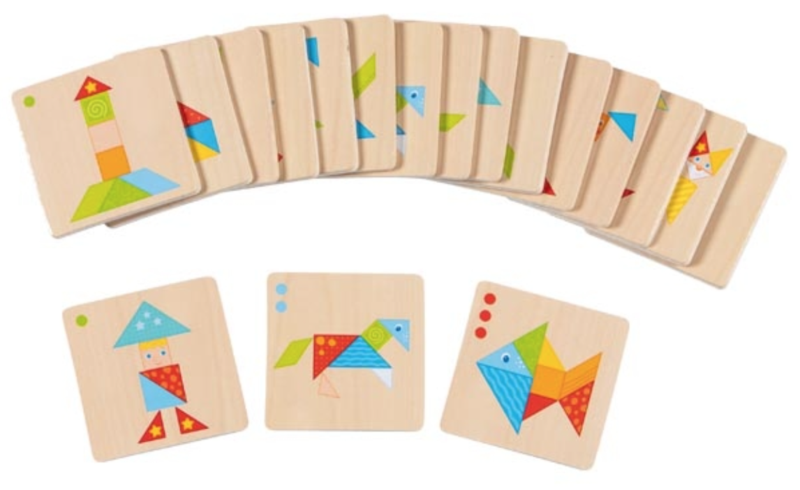 - Jogo Tangram em madeira vem com peças de madeira para montar as figuras das cartas.