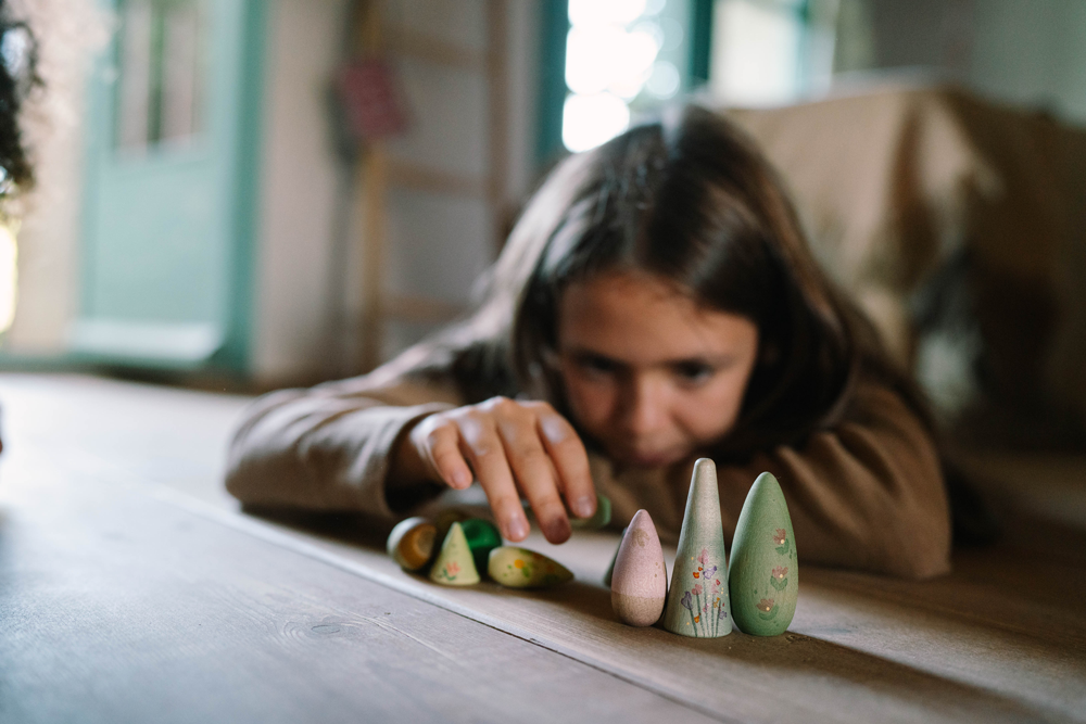 Este conjunto de árvores de madeira pintadas à mão foi criado para o brincar livre, com formas suaves e tons terra que convidam os mais pequenos a construir, organizar e explorar livremente.